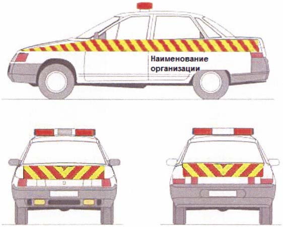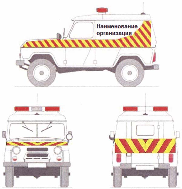 Автомобили сопровождения должны быть оборудованы оранжевыми и желтыми проблесковыми маячками. На боковых поверхностях располагаются предупреждающие значки в виде чередующихся полос, на капоте наименование организации, ведущей прикрытие перевозки негабарита.